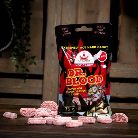 Hot Candy Dr Blood Poppamies Chili Orange Sweets - Lactose Gluten Free Vegan - Spiciness: X-HOT - Size: 75g